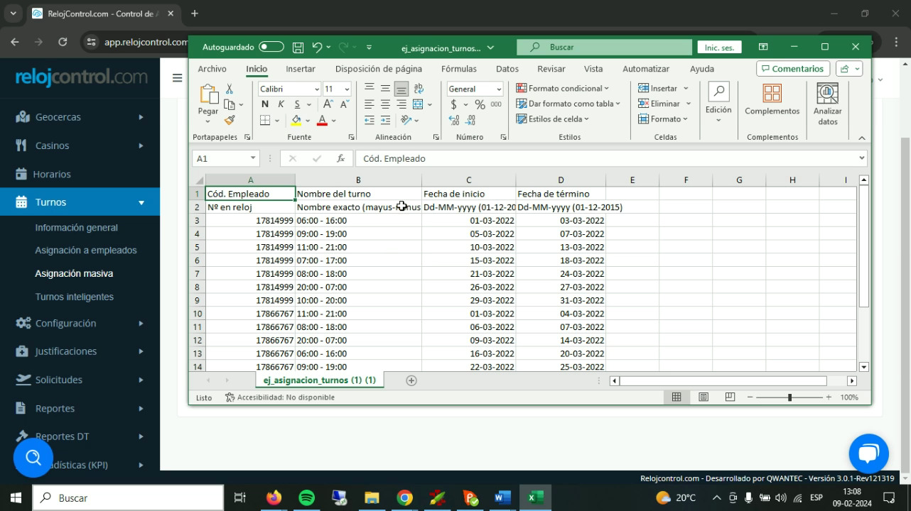 Para que los turnos sean asignados correctamente, los empleados y turnos deben estar registrados en relojcontrol.com, y los turnos deben poseer horarios asociados. Además, se debe seguir al pie de la letra el formato de la planilla a importar.